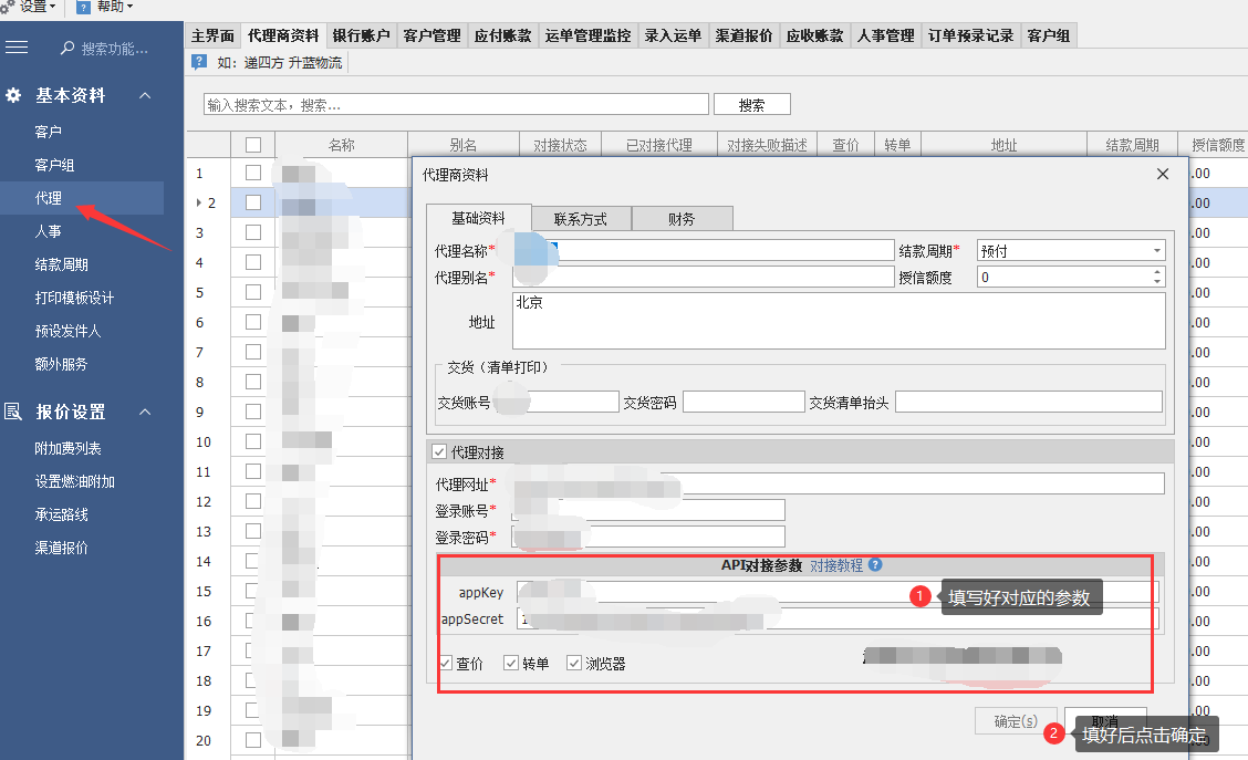 首先是需要跟您的代理提供API参数,提供后点击 基本资料【代理】双击代理填写好API参数