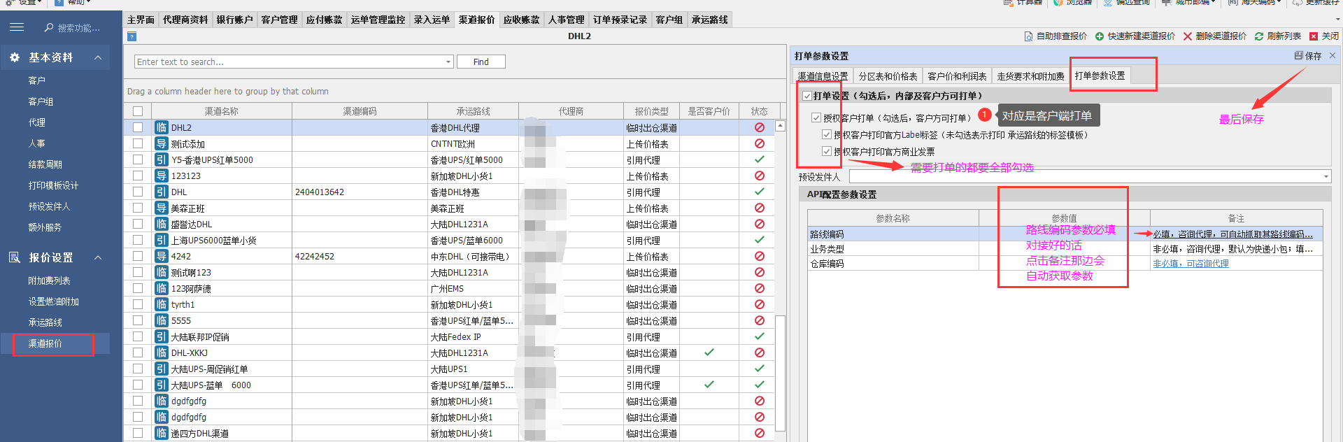 第三步 渠道加入到渠道列表后,在去渠道报价,点击对应的渠道设置打单参数,配置渠道代码