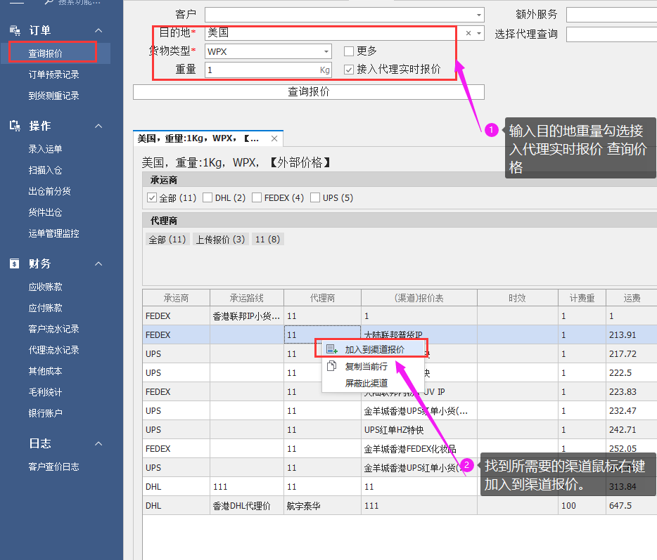 第一步在查询报价找到所需要的渠道,然后鼠标右键加入渠道列表,可以直接新建承运路线