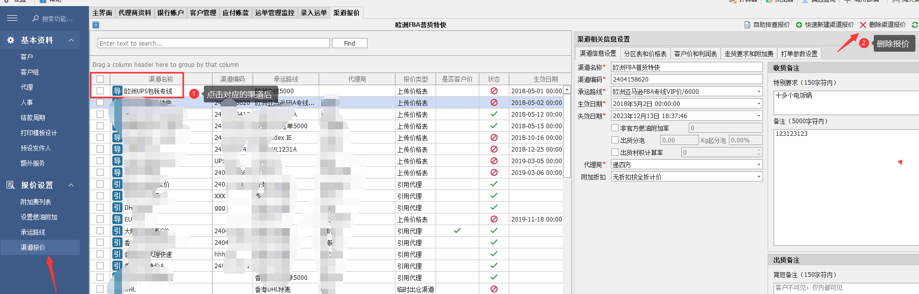 删除对接的代理步骤(注意:代理名下有产生数据的是无法删除)删除对接的代理步骤如下;第一步:点击运单管理监控功能,勾选相对应的订单 删除订单 第二步:在【渠道报价】功能,找到相对应代理名下 删除渠道报价即可文档更新时间: 2025-03-06 14:32 作者:dy13750292337