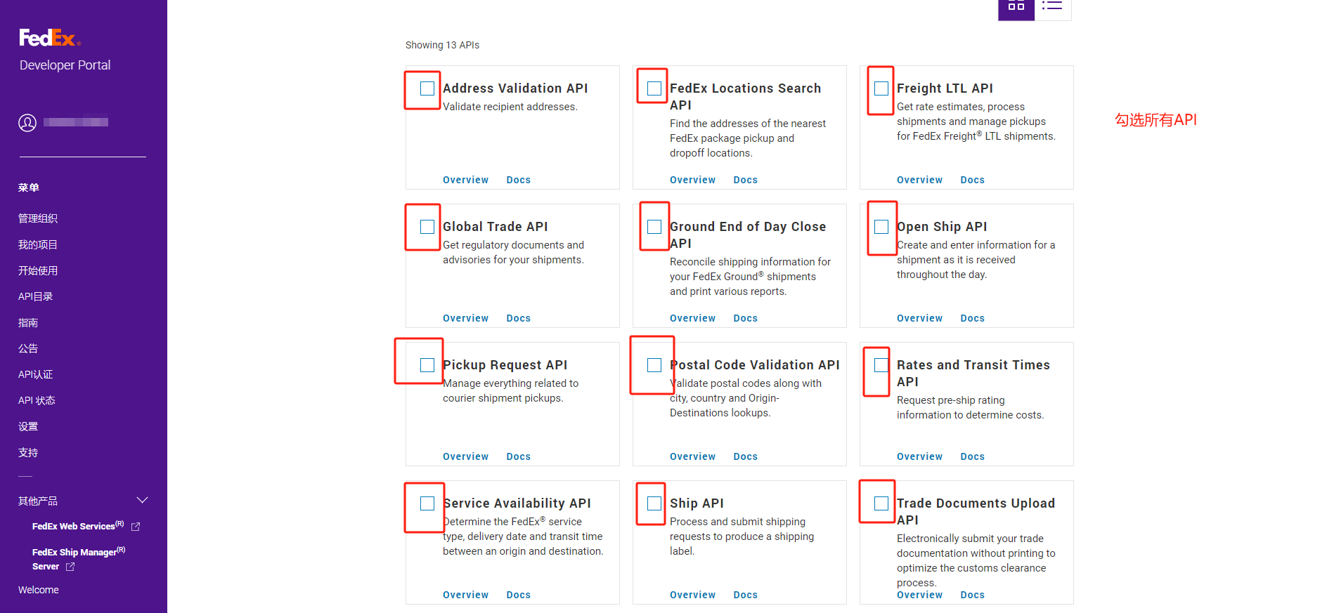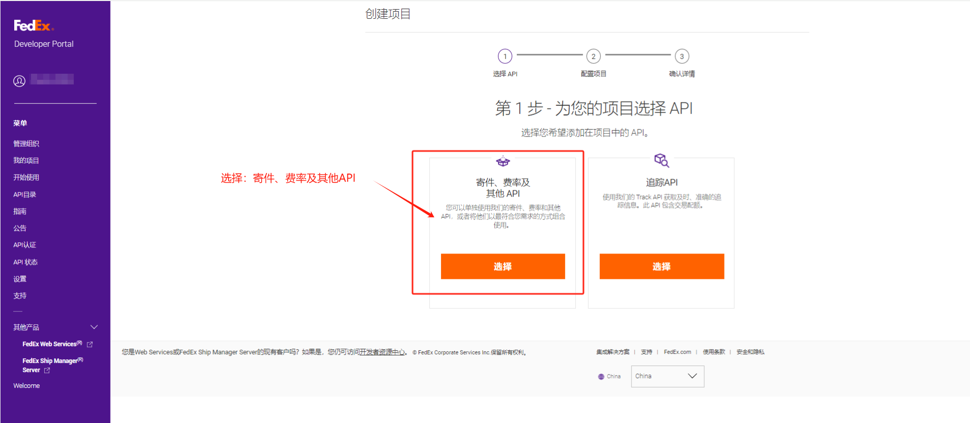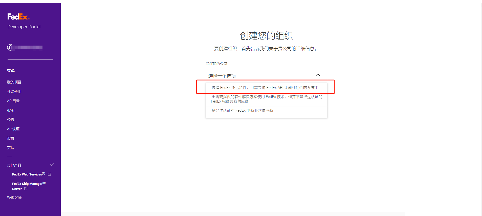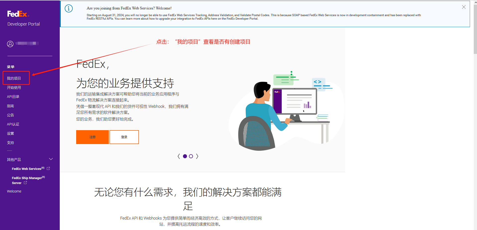 打开网站:https://developer.fedex.com/api/zh-cn/home.html# 用第一步注册的FEDEX账号,登陆开发者中心。
