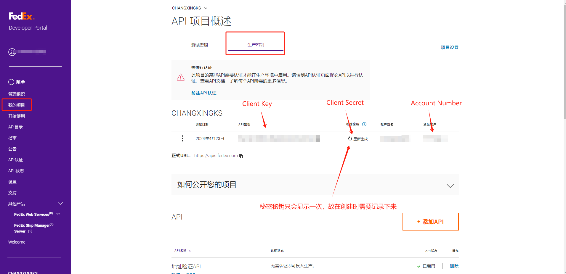 2、FedEx Production Authentication Key: 生产环境的CLIENT KEY,注意不要填写测试环境的CLIENT KEY;