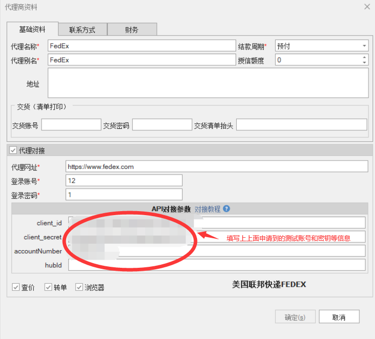 4.2、填写fedex帐号(accountNumber)、测试环境开发者授权API KEY(client_id)和SECRET KEY(client_secret)