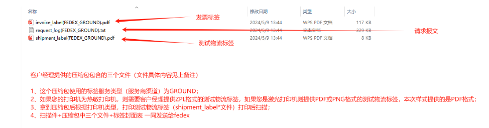 2、测试标签压缩包:向客户成功经理索要的测试标签压缩包 ,压缩包有三个文件,分别是发货标签(shipment_label.zpl或shipment_label.pdf),发票文件(invoice_label.pdf),请求报文(request_log.txt)