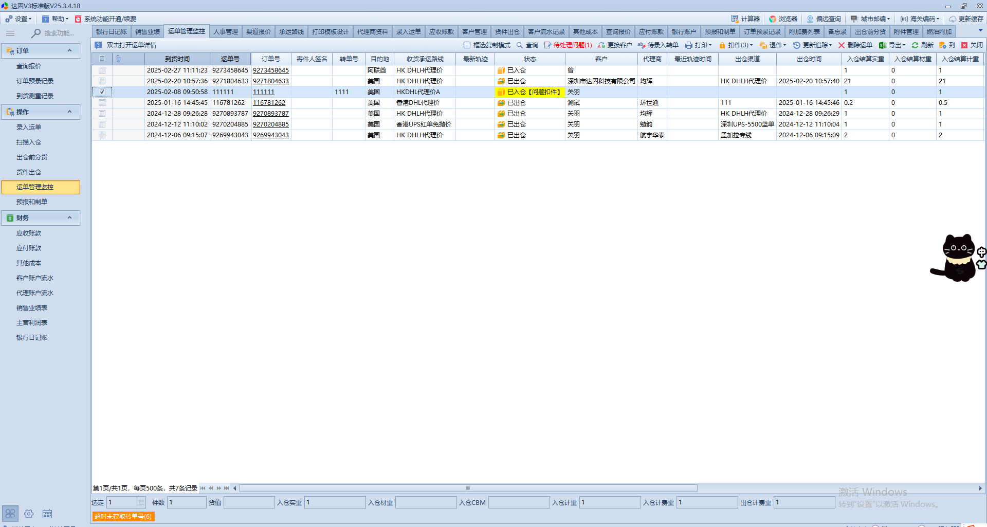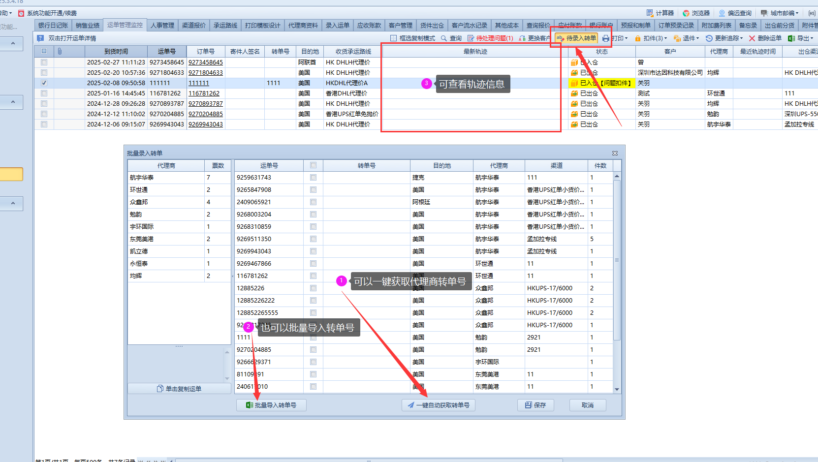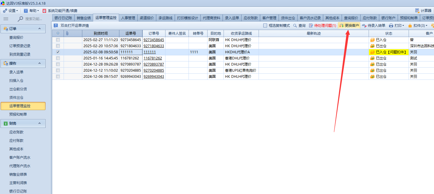 运单管理监控;所有录入到系统的单子都可以在运单管理监控查看到。在运单管理监控界面可以修改已录入的信息,修改客户名称,出货渠道,代理商,重量,费用等。 1;双击打开运单详情可以修改运单信息,收货渠道,出货渠道,代理商,以及重量 2;运单管理监控可以一键获取代理转单号,可在运单界面更新轨迹信息。 3;录错客户可以一键修改。 4;可以手动获取最新轨迹信息及调整运单状态,可导出运单材积信息及自定义界面列和状态颜色。文档更新时间: 2025-03-06 16:45 作者:dy13750292337