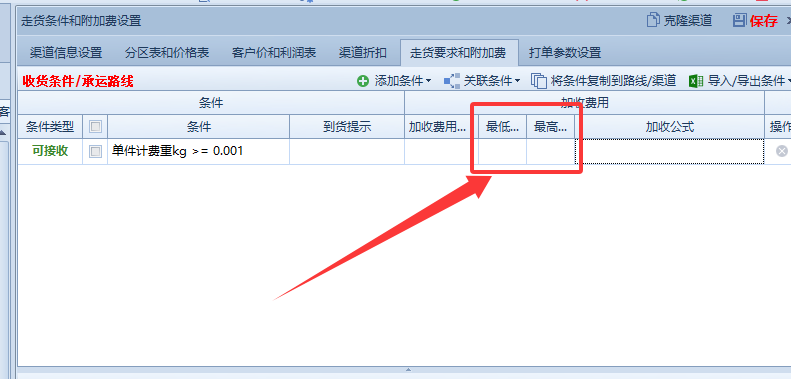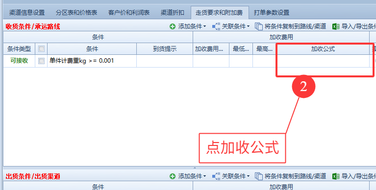 加收公式;可以设定每KG加价,每票加价,每件加价等。(根据渠道需求设定)