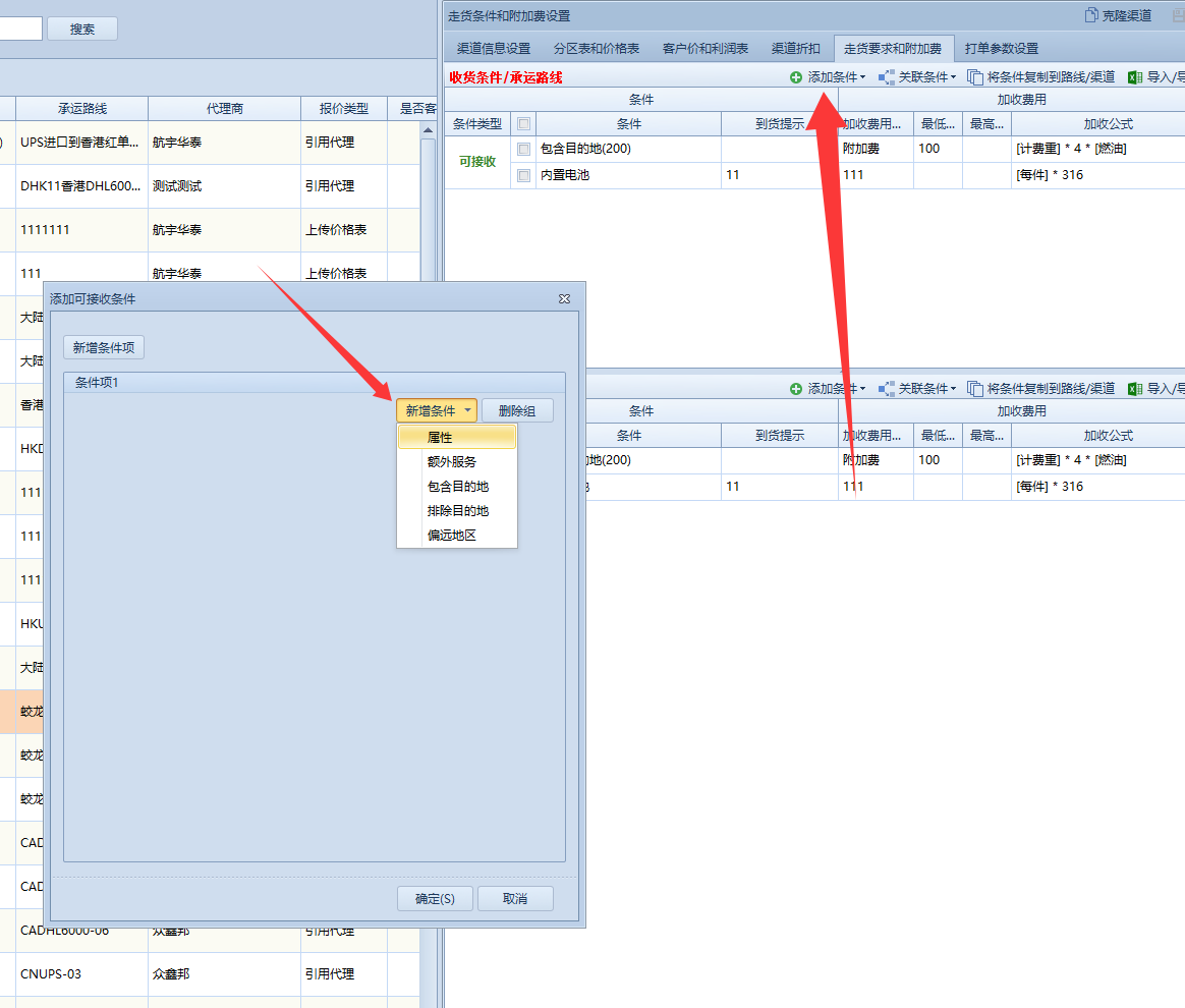 额外服务;是指特殊货物类型。可以在额外服务功能新增好后再添加条件时可以选择,后续设置条件时就可以选择渠道可以接收那些特殊货物的类型。