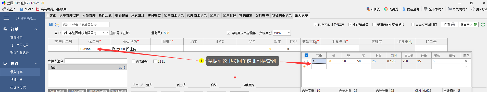2,录入好后复制运单号粘贴到录入运单界面 “即可检索录入的获取信息”