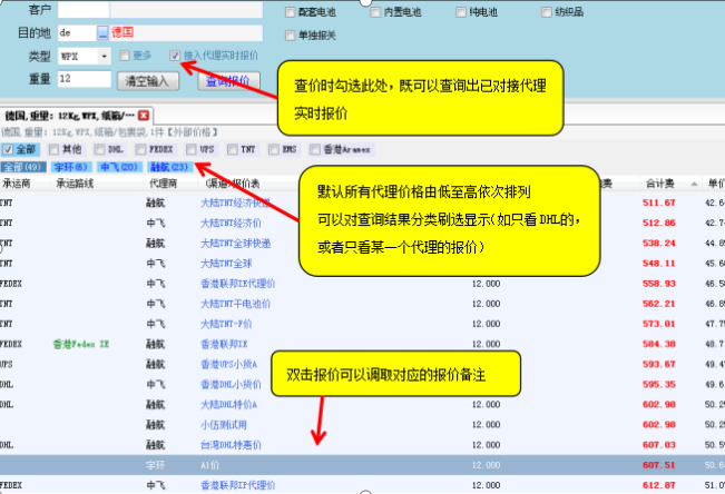 目录 搜索 新用户下载安装教程达因D2简介达因D2标准版基础概念说明刚开通怎么使用客户端对接微信公众号功能列表查询报价订单预录记录录入运单分货出仓运单管理监控应收账款应付账款运单毛利统计基本资料设置客户代理人事(权限)设置燃油附加承运路线报价导入如何建立营销公布价如何设置收货条件和附加费常用功能一键获取追踪单号如何接入代理报价自定义导出账单模版常见问题(点击左侧展开)弹出异常 CLR error:80004005系统更新异常(WIN10)WIN10安装提示无法安装.NET未能加载文件或程序集更新文件加载异常客户端查价显示不了价格排查WIN7系统安装系统常见问题框选粘贴EXCEL表格变乱如何获取DHL追踪秘钥代理系统对接说明FEDEX打单对接哲盟系统对接API方法系统升级说明2021-06-21新增功能详细介绍20210621升级存在的查价问题及解决方案2021-12-15新增功能详细介绍2024新版部分功能简介 暂无相关搜索结果! 本文档使用 MinDoc 发布 查询报价 一、查询内部上传的成本价格(即自己导入的代理报价) 二、一键调取已对接代理报价(对接方法参考“基本资料设置–代理栏目”) 三、查询客户报价(输入客户帐号,查询指定客户报价) 文档更新时间: 2019-05-22 15:27 作者:admin