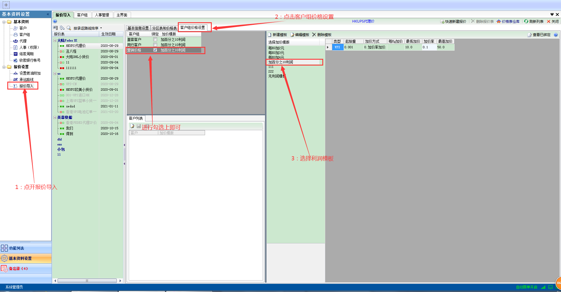 目录 搜索 新用户下载安装教程达因D2简介达因D2标准版基础概念说明刚开通怎么使用客户端对接微信公众号功能列表查询报价订单预录记录录入运单分货出仓运单管理监控应收账款应付账款运单毛利统计基本资料设置客户代理人事(权限)设置燃油附加承运路线报价导入如何建立营销公布价如何设置收货条件和附加费常用功能一键获取追踪单号如何接入代理报价自定义导出账单模版常见问题(点击左侧展开)弹出异常 CLR error:80004005系统更新异常(WIN10)WIN10安装提示无法安装.NET未能加载文件或程序集更新文件加载异常客户端查价显示不了价格排查WIN7系统安装系统常见问题框选粘贴EXCEL表格变乱如何获取DHL追踪秘钥代理系统对接说明FEDEX打单对接哲盟系统对接API方法系统升级说明2021-06-21新增功能详细介绍20210621升级存在的查价问题及解决方案2021-12-15新增功能详细介绍2024新版部分功能简介 暂无相关搜索结果! 本文档使用 MinDoc 发布 如何建立营销公布价 提示:必须是导入上传的价格表才可以建立为公布价。1:在基本资料设置-点击客户组-在客户组进行新建-新建时需要勾选设为营销价格用(仅对上传的价格表有效)2:在报价导入界面,打开上传好的价格表,点开客户组价格设置,勾选上利润模板即可。文档更新时间: 2021-04-17 11:30 作者:DY19806704304